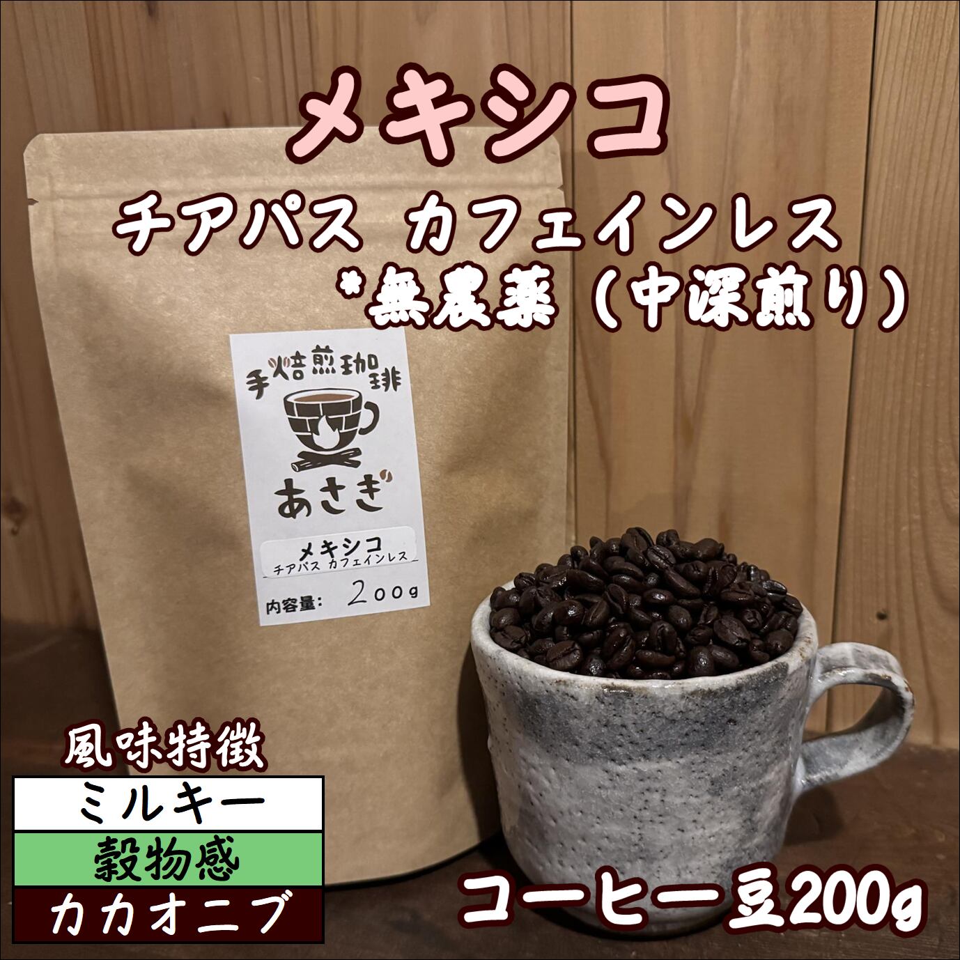 メキシコ産、農薬無使用、カフェインレスのコーヒー豆です。